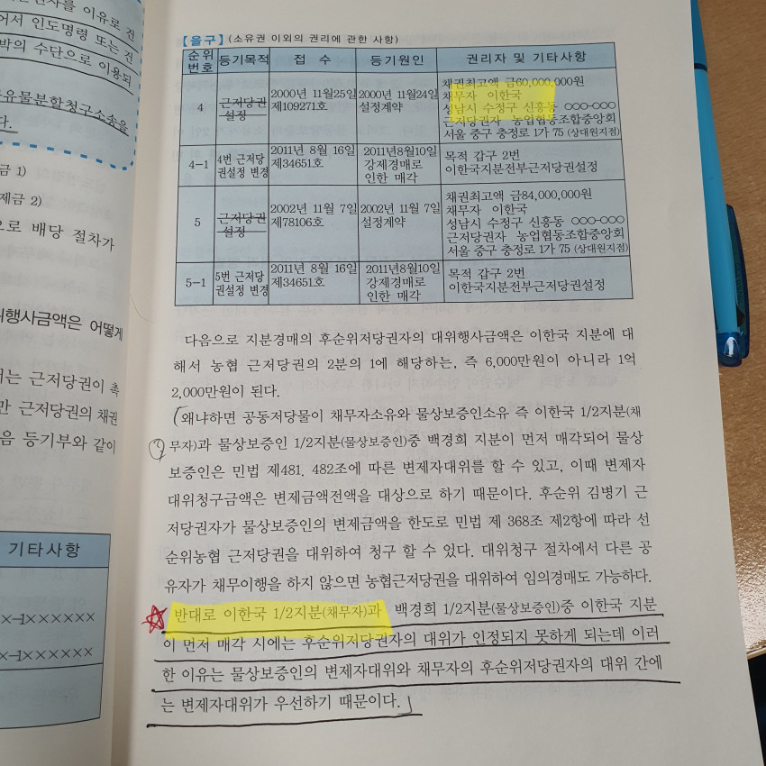 이한국1/2지분(채무자)과 백경희1/2(물상보증인)중 이한국 지분이 먼저 매각시에는 후순위 저당권자의 대위가 인정되지 못하게되는데 이러한 이유는 물상보증인의 변제자대위와 채무자의 후순위저당권자의 대위간에는 변제자 대위가 우선하기때문이다.